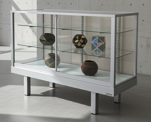 ※現行商品の在庫がなくなり次第、棚受け・棚柱が変更となります。(写真をご参考にしてください。) 材質:アルミ製からスチール製クロームメッキ仕上げと変更になります。 42.6mmピッチから25mmピッチへと変更になります。 ※関東直接配達可能地域を除いて、貨物便木枠梱包での発送となります。(原則軒先車上渡し、荷下ろしの際お手をお借りします。) 東京都23区及び近隣地域はお得な当社直接配達でお届け可能です。(原則ドライバー1人での軒先配達となり、荷下ろしの際お手をお借りします。23区以外の直接配達費については、ご購入前にお問い合わせください。) 沖縄県及び離島及への発送は現在中止させていただいておりますので、ご承知ください。 貨物便木枠梱包発送の場合、法人向けの運送便を使用、個人様への発送は平日の日中確実に荷受けのできる方に限らせていただきますので、ご注意ください。 お客様での開梱、工具が必要となります。梱包材の廃棄もお客様にお願いいたしますのでご承知ください。 自社配達の場合、木枠梱包発送の場合とも、BASE指定以外の運送会社使用のため、後払い決済は適応できませんのでご承知ください。 ・シンプルかつすぐれた耐久性を持つ業務用ガラスケースです。 ・フレームカラーはブラックまたはホワイトからお選びいただけます。 ・極めて経年変化の少ないアルマイト加工されたアルミフレームを使用、業務用ならでの耐久性を誇っております。 ・幅1200・奥行450・高さ919mm・腰上高686mm(開口部590mm) ・奥行255mmガラス棚1枚、奥行305mmガラス棚1枚合計2枚付(42.6mmピッチで高さ調整可能) ・正面または背面一方ガラス引戸(ご注文時にお選びいただきます。写真は正面引き戸タイプとなります。) ・フレーム:ブラックまたはホワイト塗装(下地:アルミ6063(車両や航空機などに使用されている素材と同様の、耐食性に優れた素材) ・棚板:5mmガラス/側板・正面(背面):3mmガラス/引戸・天板:5mmガラス/地板:ボード(アイボリー塗装) ・通常、3日から6日程度でのお届けとなります。